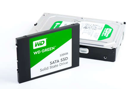 BANGKOK, THAILAND - APRIL 05, 2019: The Western Digital WD Green 120GB Solid State Drive. Western Digital is one of the larger computer hard disk drive manufacturers.