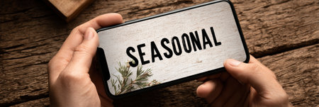 A person holds a smartphone showing the word seasonal against a textured wooden backdrop, creating a warm and inviting vibe with natural touches.