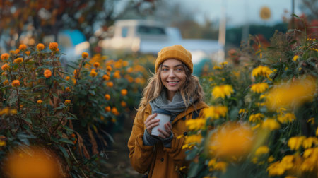 Young woman holding a coffee cup while enjoying the autumn scenery in a garden surrounded by vibrant yellow flowers.