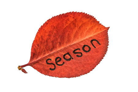 Big red autumn leaf with the inscription SEASON, isolated on awhite background