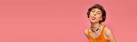 cheeky playful girl in 20s with short brunette hair sticking tongue out on pink background, banner