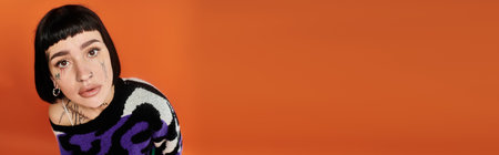 A confident young woman showcases her style in a bright sweater, accentuated by bold tattoos and a warm background.