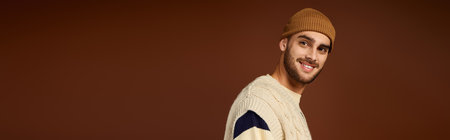 A young man exudes confidence in a cozy knitted outfit and beanie, set against a brown background, banner