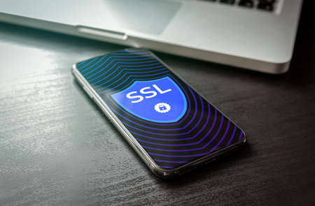 SSL certificate - Secure Sockets Layer icon concept on smartphone screen. Security data technology for encrypted connection between client and server. HTTPS cybersecurity internet computing protocol.