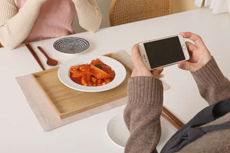 asian korean women taking photo of food, spending time indoors, social distance in winter