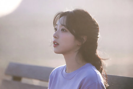 A young Asian woman with short hair looks thoughtfully towards the horizon during a serene sunset, capturing a moment of reflection and peace.