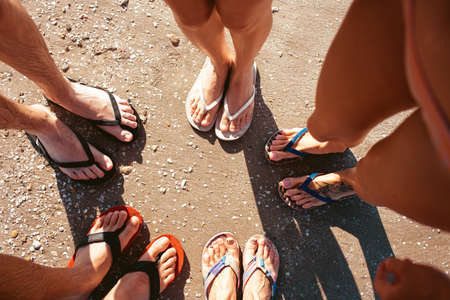 Five pare of legs on the sand of the beach