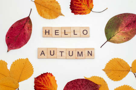 Hello Autumn text made from wooden blocks with leaves. Autumn backdrop