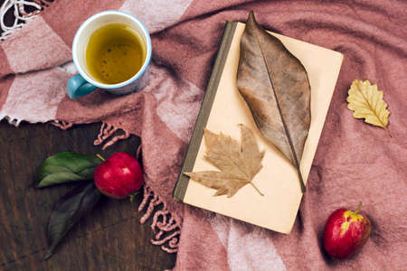 Cup of tea with lemon and knitted scarf on rustic background full of autumnal leaves with copyspace