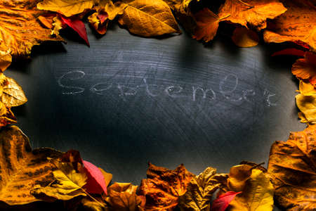 Colorful and bright background of fallen autumn leaves. the inscription is the autumn on parchment. Autumn concept.