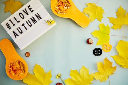 Autumn decorations and food background. Text hashtag I love autumn. Fresh pumpkins, yellow leaves and chestnuts. Copy space.Top view. High quality photo