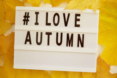 Text hashtag I love autumn. Aesthetic autumn yellow leaves background close up. Top view. Trendy autumn background. High quality photo