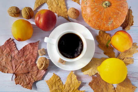 Autumn background of dry leaves with a white porcelain cup of coffee, a small beautiful pumpkin, lemon, ripe nectarines and walnuts. Horizontal orientation, selective focus, top view.