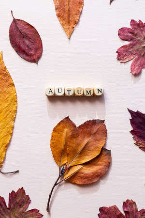Minimalistic seasonal composition. The word AUTUMN made of wooden cubes on a pink background with colored autumn leaves