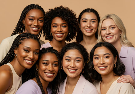 Diverse group of smiling women with different skin tones and hairstyles looking at the camera on a neutral background. Beauty and inclusion concept.