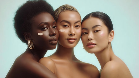 Group of three beautiful women with different skin tones, with moisturizing cream on their faces. Cosmetic treatments.