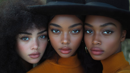 A stunning close-up of three stylish women wearing autumn attire, showcasing beauty and confidence. Their diverse features and warm expressions emphasize friendship and modern fashion in a natural setting.