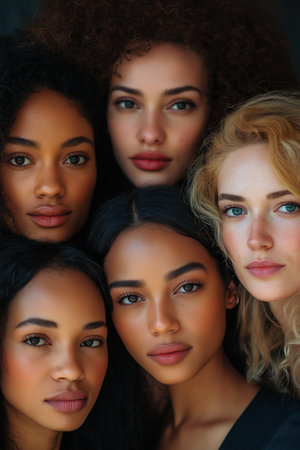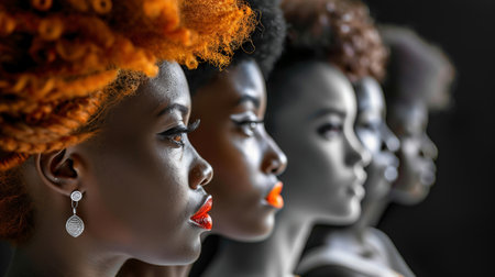 This stunning image features diverse female profiles highlighting unique beauty. Each woman showcases individual expressions and features, celebrating diversity and unity in female representation.