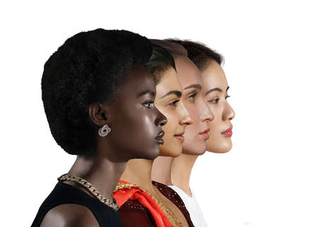 Caucasian woman, african american, asian woman and indian women profile portrait isolated on white background. Diverse nations equality. Multiple different races female friendship concept.