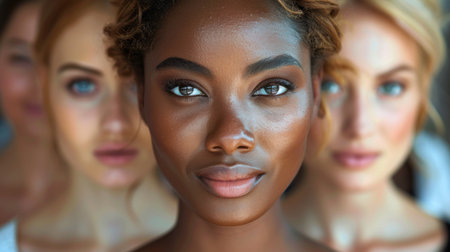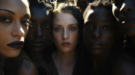 Portrait of multi-racial women standing together, their expressions confident and proud, celebrating sisterhood.