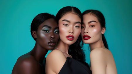 Stunning portrait of multicultural women, reflecting beauty diversity in a vivid colored background.