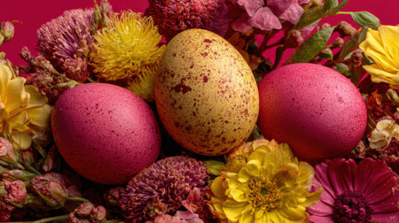 Colorful Easter eggs surrounded by a variety of flowers, perfect for spring holiday themes and advertising.