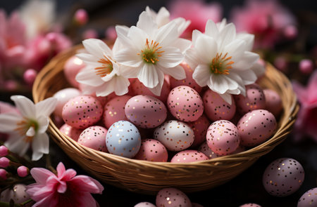 Easter eggs with cherry blossom branches. Festive spring celebration pastel arrangement. Generate ai