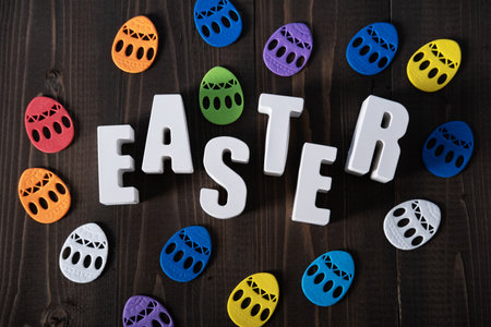The inscription Easter in three-dimensional letters made of plaster with a decor in the form of Easter eggs.