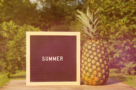 Fresh Pineapple outdoors with summer sale signboard, garden in background Shallow DOF