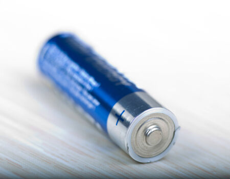 blue AA battery with the word power stands vertically on a white background and casts a shadow