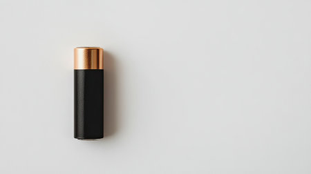 A black and copper battery positioned on a gray surface, highlighting its role as an energy source for various electronic devices and tools, emphasizing modern technology's reliability.