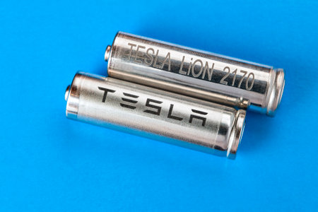 St. Petersburg, Russia - November 30, 2017: Two cylindrical battery with Tesla logo, for a pack of cells, on light blue background.