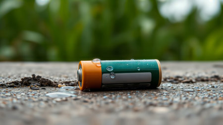 Battery with Water Droplets. Close-up of a battery with water droplets on a concrete surface.