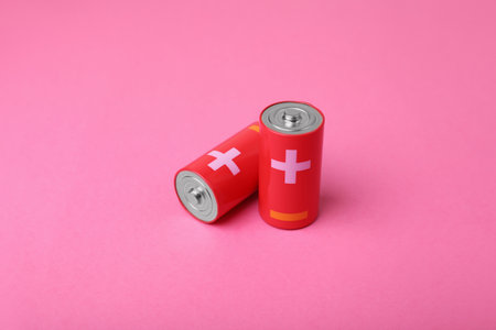 Alkaline batteries on pink background, closeup