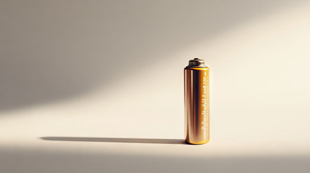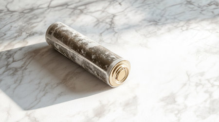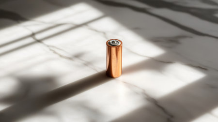 A single copper battery stands prominently on a marble surface, illuminated by natural light, casting distinct shadows that enhance its sleek design and craftsmanship.