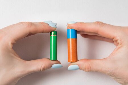 Hand hold many batteries. Close up