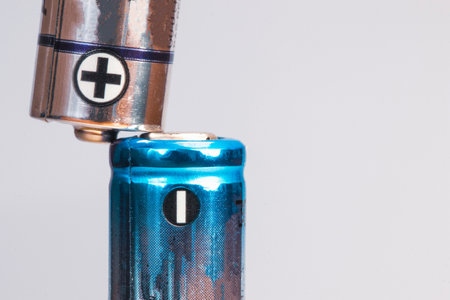 A closeup shot of one positive and one negative battery with their heads touching at an angle