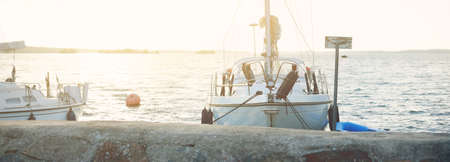 Sloop rigged yacht and inflatable boat moored to a pier at sunset. Mälaren lake, Sweden. Summer vacations, tourism, cruise, yachting, recreation, sport, leisure activity, lifestyle