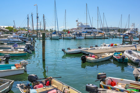 Key West, Florida, United States - April 12, 2012: motor and sailing boats docked at Harbor of Key West in Florida in a sunny day.