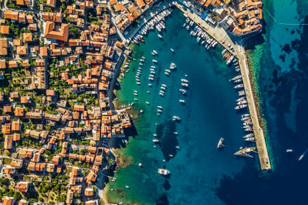 Komiza, Croatia - Aug 19, 2020: Aerial overhead shot of Komiza town port of Vis Island before sunrise in Croatia morning
