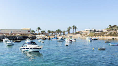 A landscape of the port of Tabarca with the sea with many boats with a clear blue sky in alicante, spain