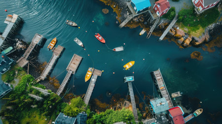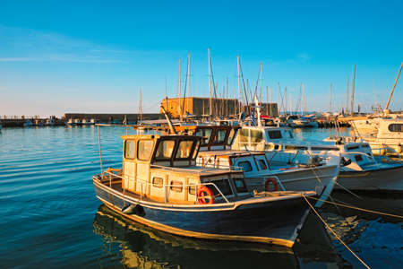 Drone aerial scenery of a fishing port. Fishing boats and yachts moored in the harbour