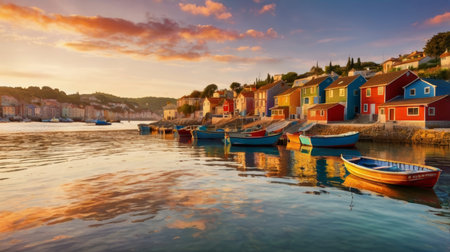 A serene coastal town at sunrise with fishing boats in the harbor, pastel-colored houses along the shore, and gulls flying overhead. The peaceful scene captures maritime charm.