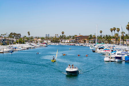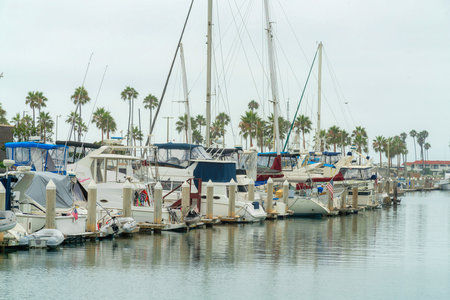 Aerial view of boats and yachts docked at the marina on the coast of California USA