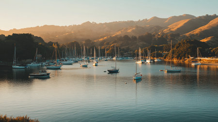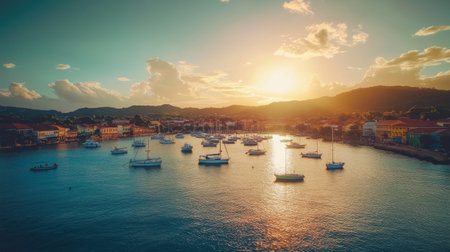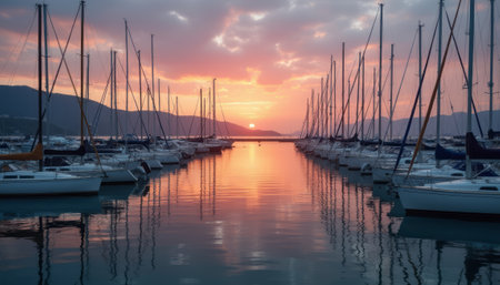 A breathtaking sunset casts a warm glow over a serene marina, with sailboats gently bobbing in the calm waters. The vibrant hues of orange and pink reflect beautifully on the waters surface, creating a picturesque scene that evokes peace and tranquility.