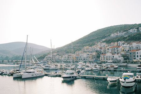 Aerial view of the yachts in front of the residential complex Lustica Bay. Montenegro