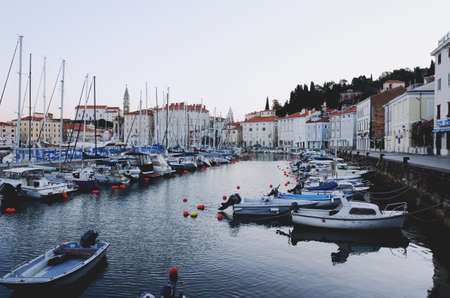 Scenic view of red roofs of the historical center of old town Piran with Tartini Square against the sunrise sky and Adriatic sea. Aerial view, coast of Slovenia.