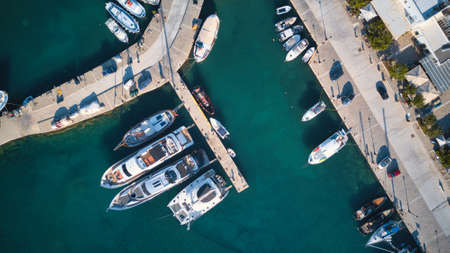 Top view of luxury yachts in the harbor, aerial shoot with drone. Concept of tourism and recreation