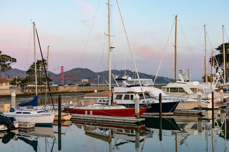 San Francisco, California / USA - Feb 7th 2019 - yachts in a marina in front of Golden Gate Bridge on February morning