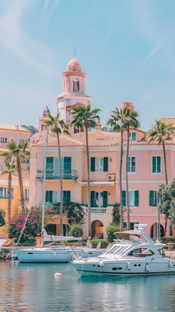 Multiple boats are moored in front of a vibrant pink building, creating a colorful and lively waterfront scene. The boats show various sizes and designs, while the building stands out with its unique color.